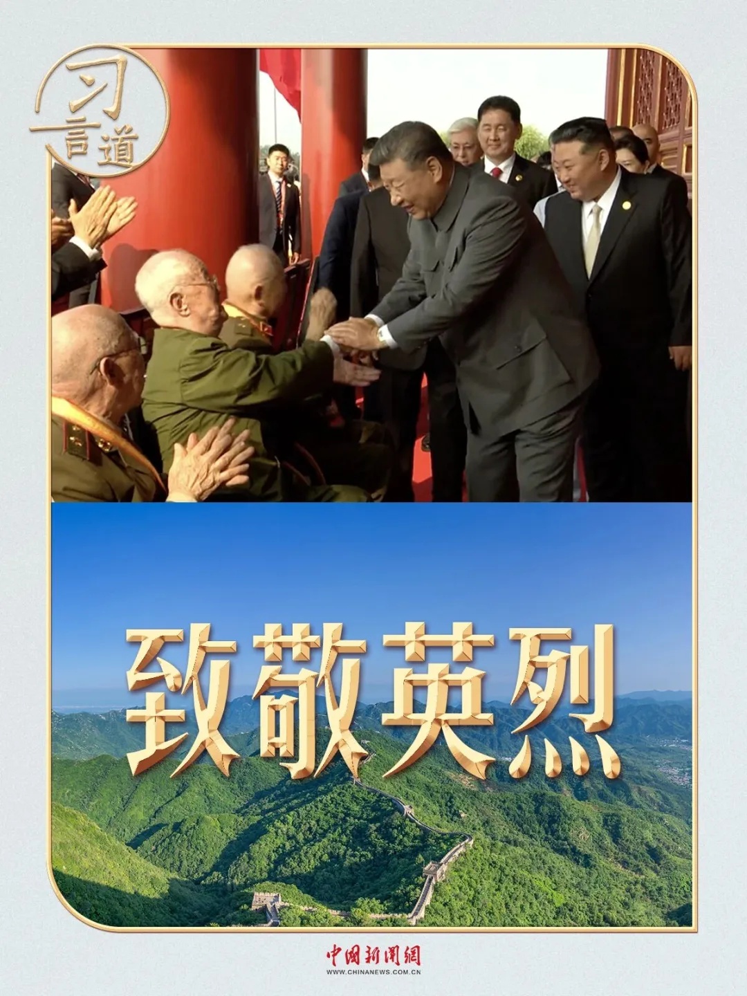 紀念中國人民抗日戰爭暨世界反法西斯戰爭勝利80周年大會開始前,習近平總書記登上天安門城樓時,同抗戰老戰士老同志代表親切握手,向他們表示崇高敬意。