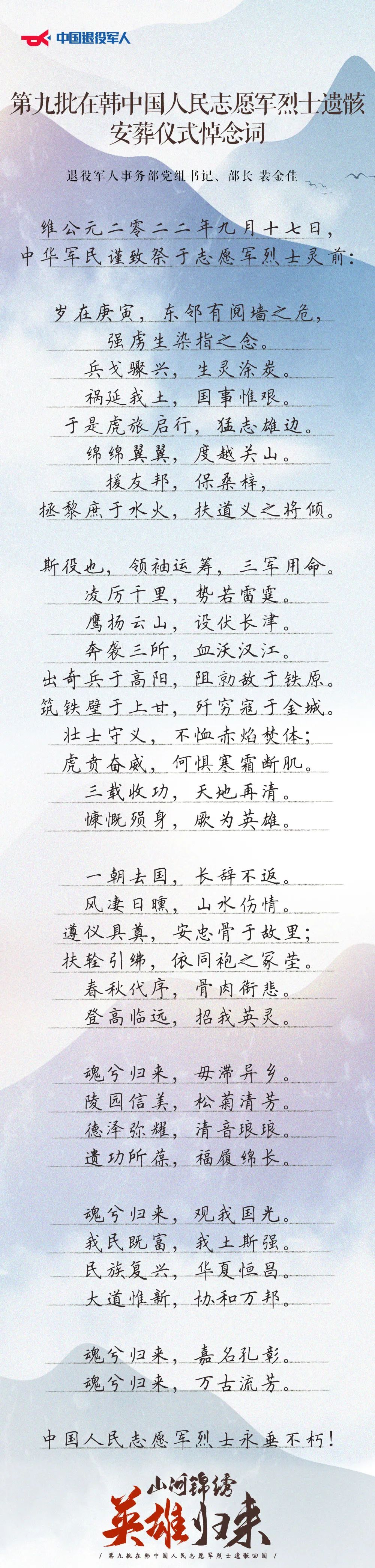 裴金佳致第九批在韓志愿軍烈士遺骸安葬祭文