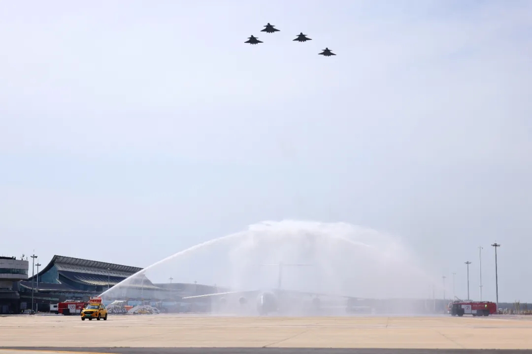 10時57分,空軍運–20專機緩緩降落在遼寧沈陽桃仙國際機場。專機進入中國領空后,空軍4架殲–20戰斗機護航,并在機場上空通場,“雙20”同框向志愿軍烈士致以崇高敬意,桃仙國際機場以“過水門”航空最高禮儀迎接志愿軍烈士遺骸回家。