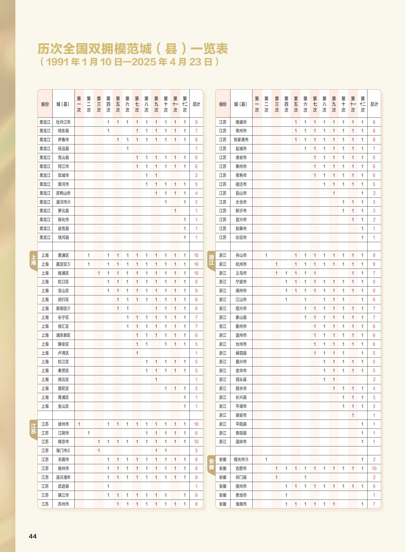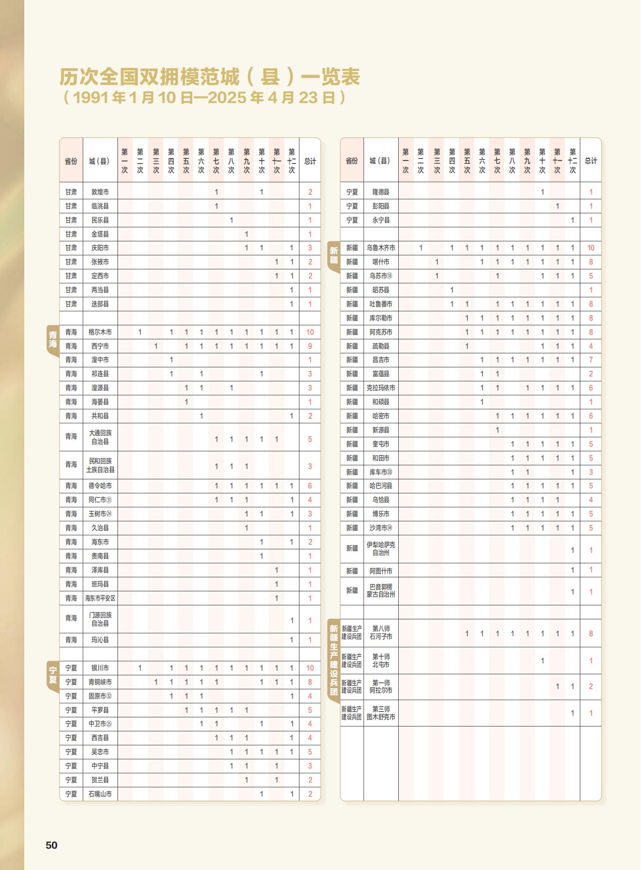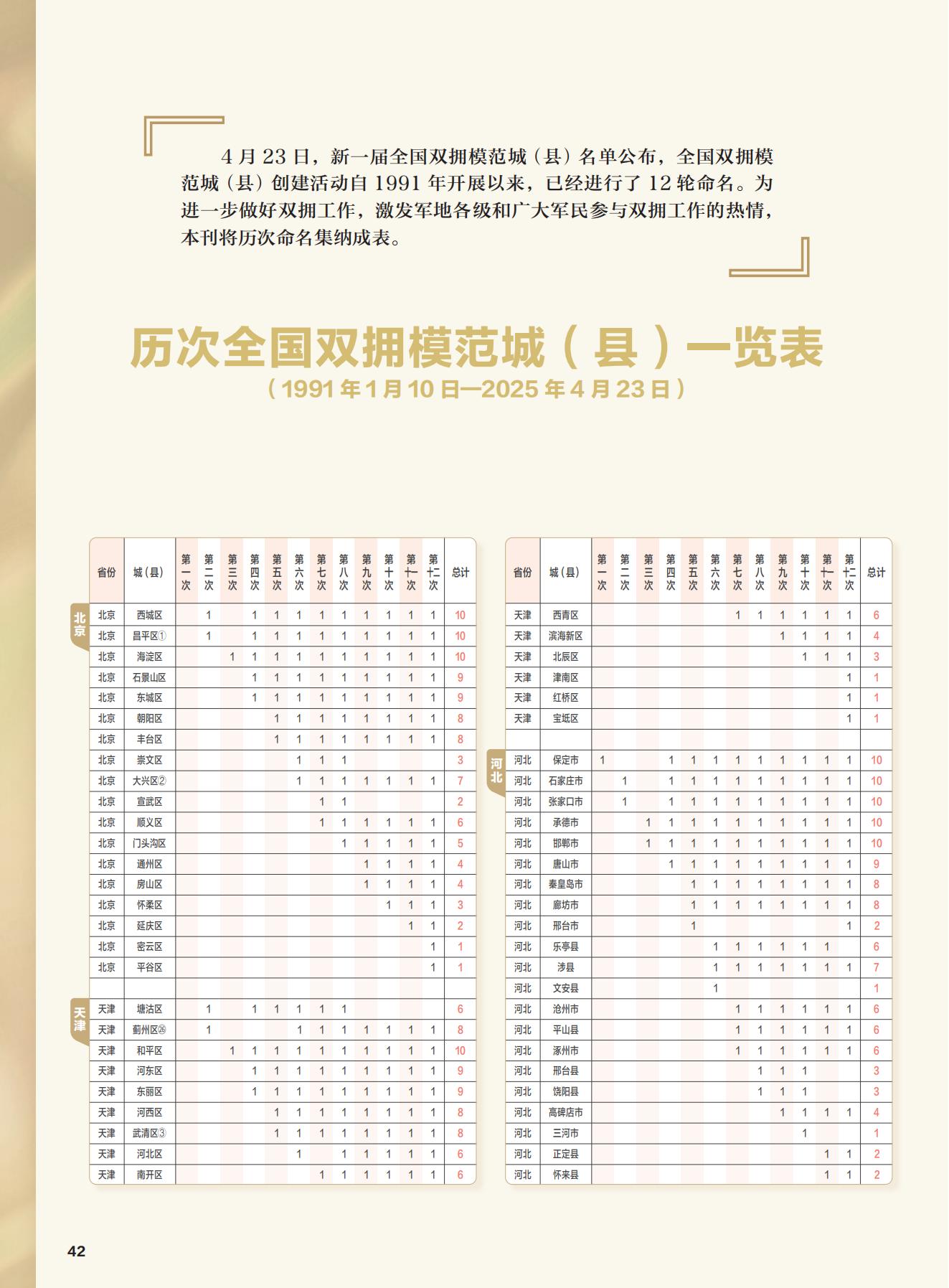 4月23日,新一屆全國雙擁模范城(縣)名單公布,全國雙擁模范城(縣)創建活動自1991年開展以來,已經進行了12輪命名。為進一步做好雙擁工作,激發軍地各級和廣大軍民參與雙擁工作的熱情,本刊將歷次命名集納成表。